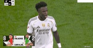 第72分鐘,皇馬主帥哈維·阿隆索將維尼修斯換下,對於這一安排,維尼修斯很不理解,在場上用手勢和口型抱怨,“我?”