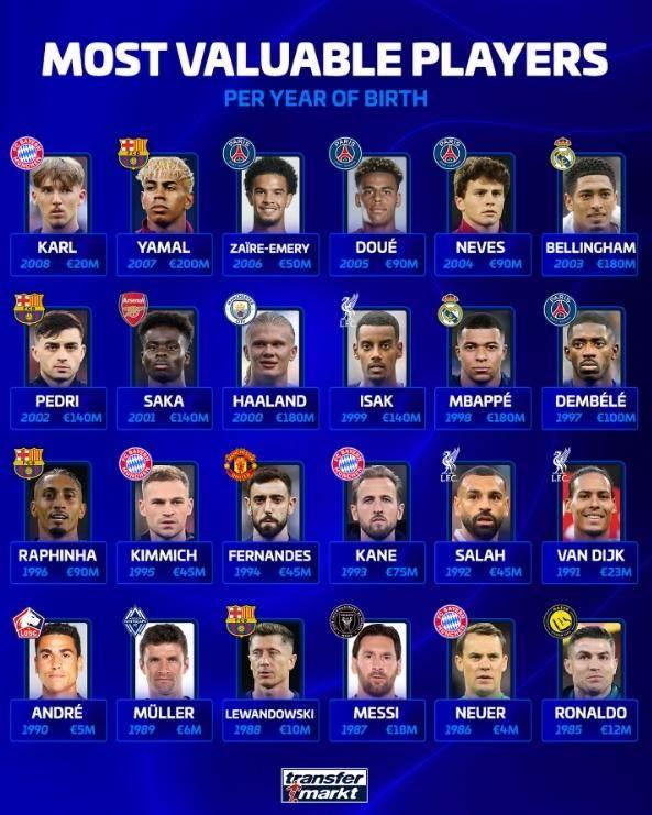 德轉統計了各年齡段身價最高球員,其中,梅西、C羅、哈蘭德、姆巴佩等人在列。各年齡段身價最高球員: