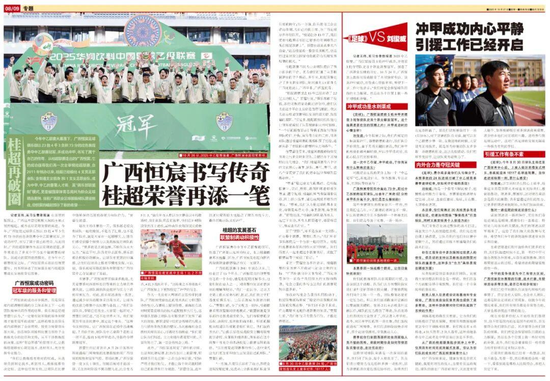 記者王偉、實習生李信報道 2025中乙聯賽,廣西恆宸提前5輪衝甲成功,並提前3輪奪得隊史首個職業聯賽冠軍,創造了廣西職業足球的歷史。10月24日,廣西恆宸主教練劉俊威接受了本報獨家專訪。談及衝甲成功,劉俊威心情很平和。展望下一步工作時他表示:“我們肯定會保留球隊目前的主力框架,然後在各個位置上做一些針對性的補強。”