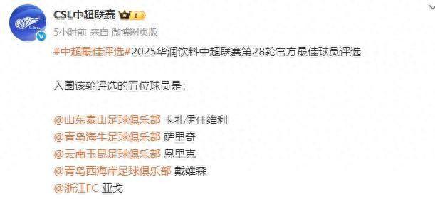 體壇週報全媒體原創10月28日,中超官方公佈第28輪最佳球員候選名單,分別是瓦科·卡扎伊什維利、薩里奇、恩裏克、戴維森以及亞戈·卡列洛。卡扎伊什維利(山東泰山):4射2正2進球,4次創造機會薩里奇(青島海牛):4射3正3進球,6次創造機會1次助攻恩裏克(雲南玉昆):5射4正2進球戴維森(青島西海岸):2射2正2進球,2次創造機會亞戈·卡列洛(浙江隊):2射2正2進球