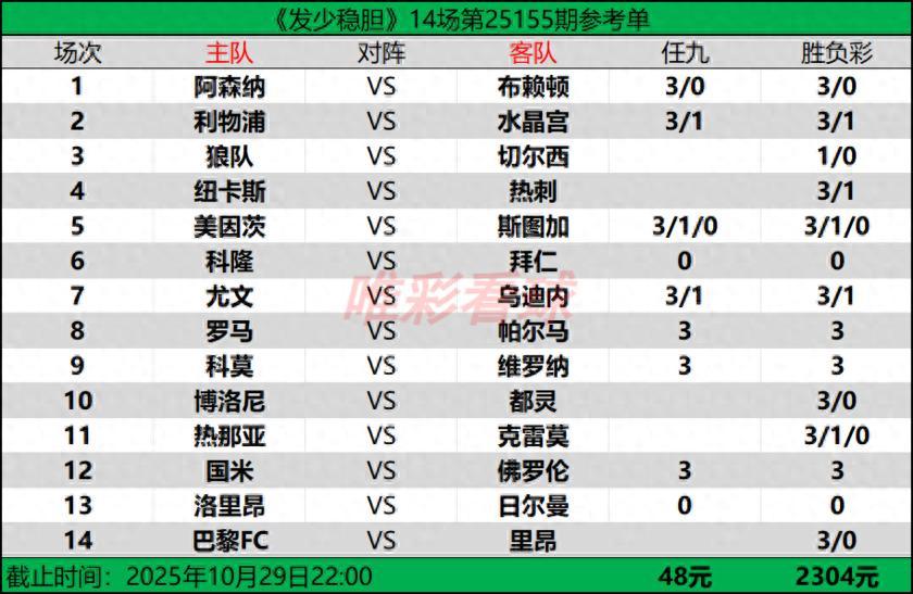 【發少穩膽25155期勝負彩14場(2304元)任九(48元)推薦方案】