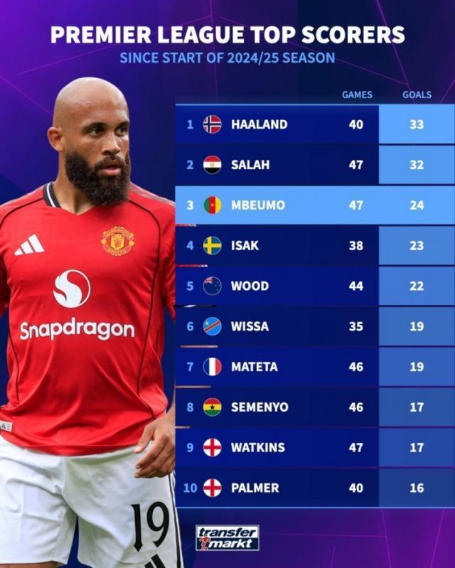 上賽季至今英超射手榜:哈蘭德反超薩拉赫,姆伯莫、伊薩克列前四
