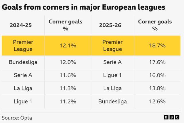 這個趨勢不僅存在於英超,五大聯賽的角球破門佔比都比前一賽季有了提高。英超是從12.1%提升爲18.7%,德甲和意甲也有類似的明顯漲幅,西甲和法甲的漲幅則低出不少(下表)。