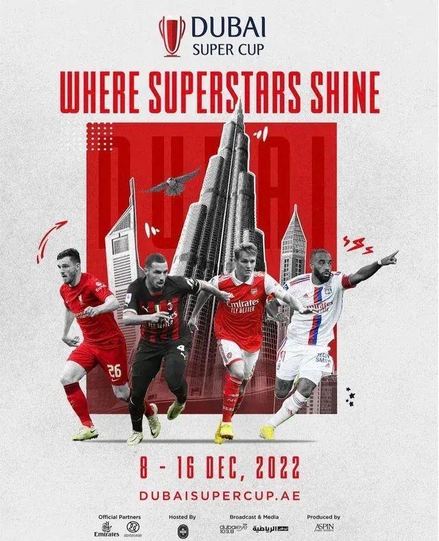 阿森納、利物浦已確定參加“迪拜超級盃”,這項商業賽事還有里昂和米蘭參與,賽期是12月8日-16日。4傢俱樂部的主贊助商都是總部在迪拜的阿聯酋航空,它們此前也已多次造訪迪拜。阿森納分別在12月8日和13日對陣里昂與米蘭,利物浦則在12月11日和16對壘相同對手。賽制也比較特殊,勝者得3分,平局得2分,而且每場無論比分如何都會進行點球大戰,勝者將再得1分,總積分最高者拿到獎盃。