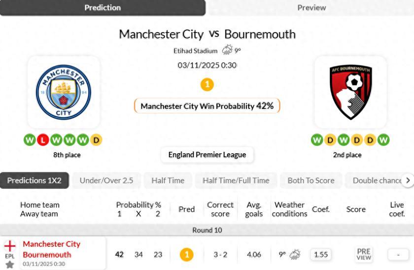 在最近4場英超主場比賽中對陣伯恩茅斯,曼城均在半場和全場結束時都取得勝利。