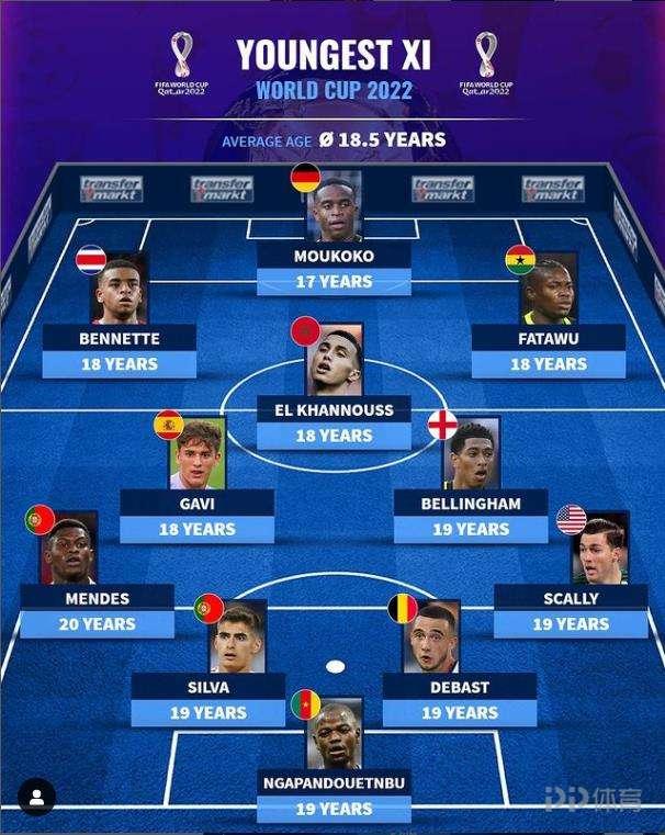 北京時間11月16日,德轉盤點了參加本屆世界盃最年輕球員組成的最佳陣容。穆科科領銜,加維、貝林厄姆在列,平均年齡爲18.5歲。本屆世界盃最年輕球員陣容門將:恩加潘多涅布(喀麥隆,19歲)後衛:斯卡利(美國,19歲),德巴(比利時,19歲),安東尼奧-席爾瓦(葡萄牙,19歲),門德斯(葡萄牙,20歲)中場:貝林厄姆(英格蘭,19歲),加維(西班牙,18歲)前場:法塔武(加納,18歲),哈努斯(摩洛哥,18歲),本內特(哥斯達黎加,19歲)前鋒:穆科科(德國,17歲)