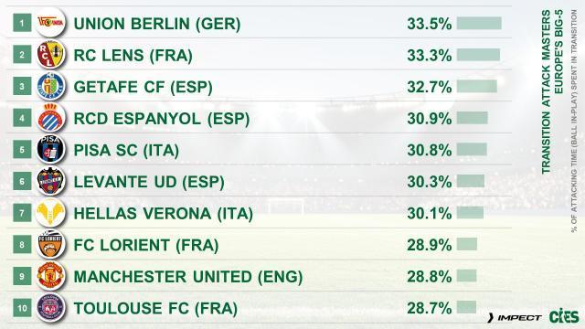 另一個榜單是最熱衷轉換進攻的球隊,雖然轉換進攻與傳統的防守反擊並不能完全劃等號——轉換進攻強調由守轉攻的過程,但不一定是消極蹲守,也可以是陣型前壓,在中前場就展開逼搶。但總的來說,防守反擊也屬於轉換進攻,而我們也可以看到這個榜單前十幾乎一水是各聯賽的中下游球隊,唯獨排名第九的曼聯成了豪門“顯眼包”。當然,戰術本無高低優劣之分,黑貓白貓,能抓老鼠就是好貓。朗斯目前法甲第三(上賽季第八),靠的是聯賽防守第二好的表現,相比同分的馬賽他們進球不多,反而是錯失進球機會的數據法甲第一,這也說明了他們的確通過轉換進攻獲得了大量機會。