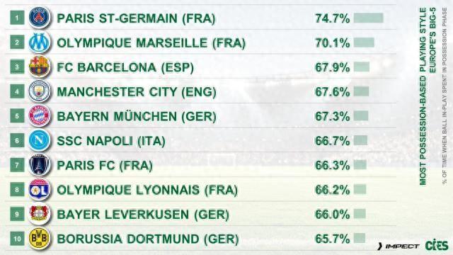 “足球天文臺”(CIES)公佈歐洲五大聯賽球隊“陣地進攻”和“轉換進攻”榜單。排名顯示,法甲的巴黎和馬賽最熱衷於通過掌控球權發起進攻,佔比超過了70%,排名三四的則是傳控大師巴薩和曼城。值得注意的是,前五的球隊中,瓜迪奧拉執教過巴薩、拜仁、曼城三支球隊,恩裏克和弗利克也執教過其中兩支,拜仁主帥孔帕尼在曼城師承瓜迪奧拉,拜仁當初選擇孔帕尼,也是得到了瓜帥的充分肯定。可以說,瓜迪奧拉主義目前仍是菁英足球世界的頂層哲學源頭。