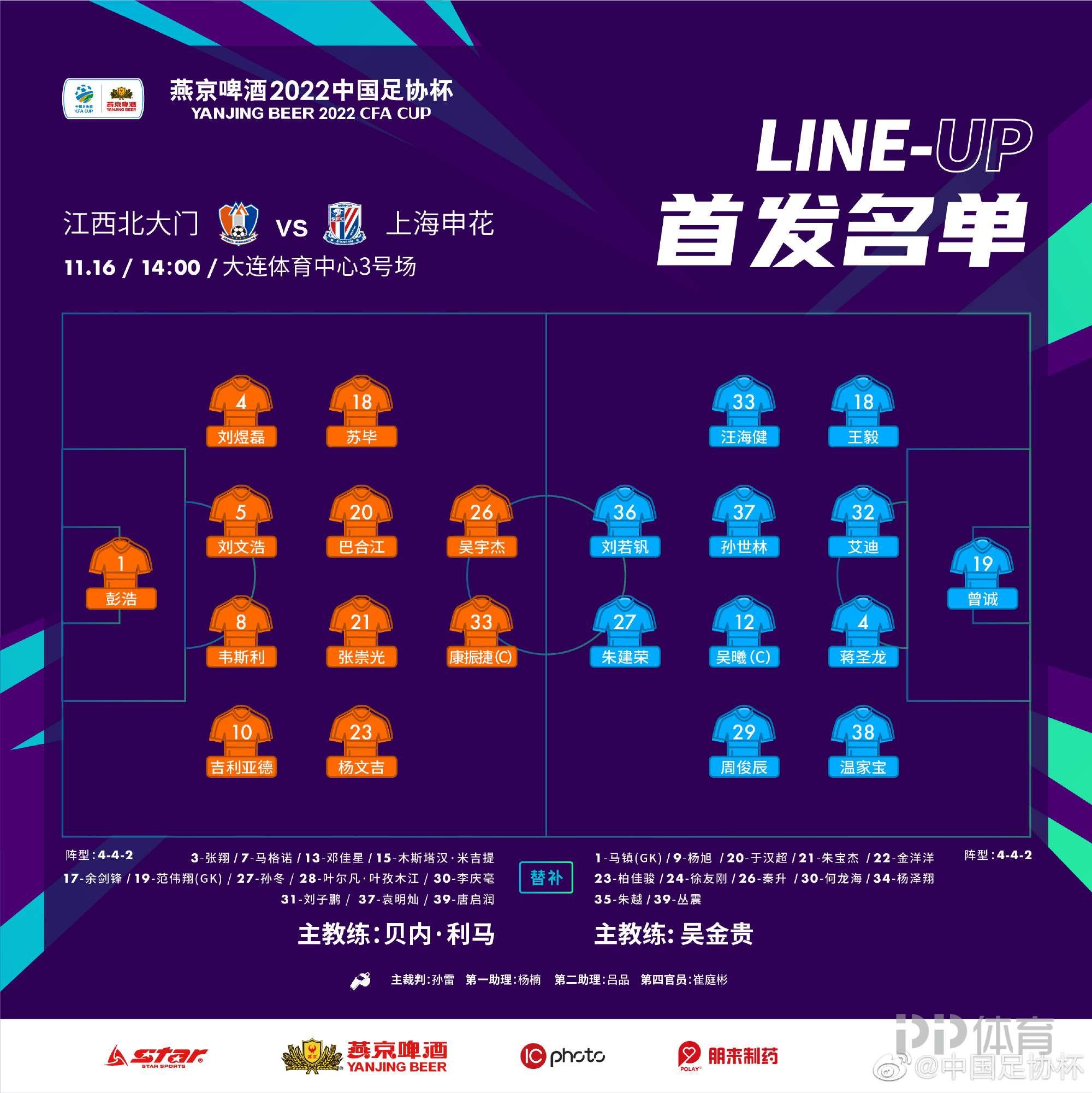 北京時間11月16日14:00,足協盃第二輪展開爭奪,江西北大門挑戰上海申花。首輪比賽中,江西北大門4-3險勝新疆天山雪豹。第24分鐘,劉若釩右腳抽射破門,隨後朱建榮擴大比分,半場結束,上海申花2-0領先江西北大門。下半場,朱建榮和劉若釩先後完成梅開二度。替補登場的徐友剛也完成進球。