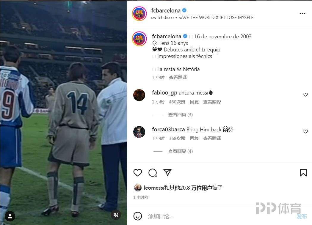 巴薩在官方INS上表示:2003年11月16日。16歲的少年,紅藍生涯一線隊首秀,給教練留下深刻的印象,接下來的事情大家都知道了。隨後梅西本人點讚了這條動態。