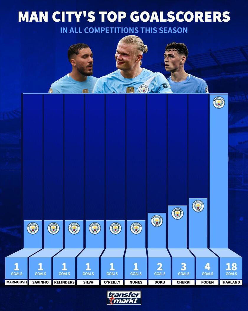 本場賽事前,哈蘭德在各項賽事中打入18球遠超其他隊友