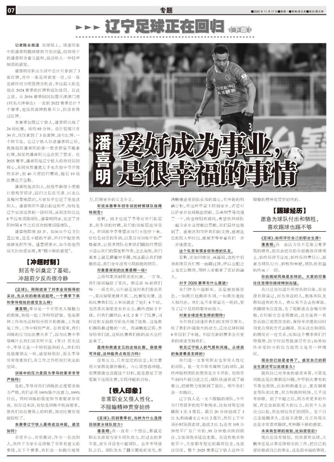 遼寧鐵人是一支不服輸的球隊,今年我們有很多的絕平和絕殺,比如對陣定南贛聯1比3落後,最後20分鐘追成了3比3;和南通支雲0比2落後,然後上下半場補時階段進球,追成2比2;還有105分鐘絕平廣東廣州豹、95分鐘絕殺陝西聯合、主客場絕殺延邊龍鼎。在這些絕殺和絕平中,大家都有堅定的贏球信念,也彼此信任,整個2025賽季遼寧鐵人這種不服輸的精神是貫穿始終的。