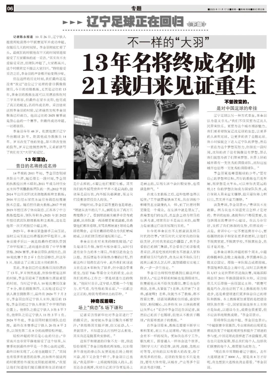 但在這樣的歷史時刻,我們最終還是沒有“放過”這位遼寧足球的昔日偶像級球員,今日的功勳教練,尤其是過往的13年,李金羽的教練生涯可以用漂泊和坎坷二字來形容,但最終在家鄉瀋陽,他完成了真正的蛻變:名將終成名帥。採訪結束送別李金羽的時候,記者赫然發現李金羽鬢角已經斑白,他說過往的2025賽季就是熬心血的一個賽季,但最終成功衝超,一切都值得。