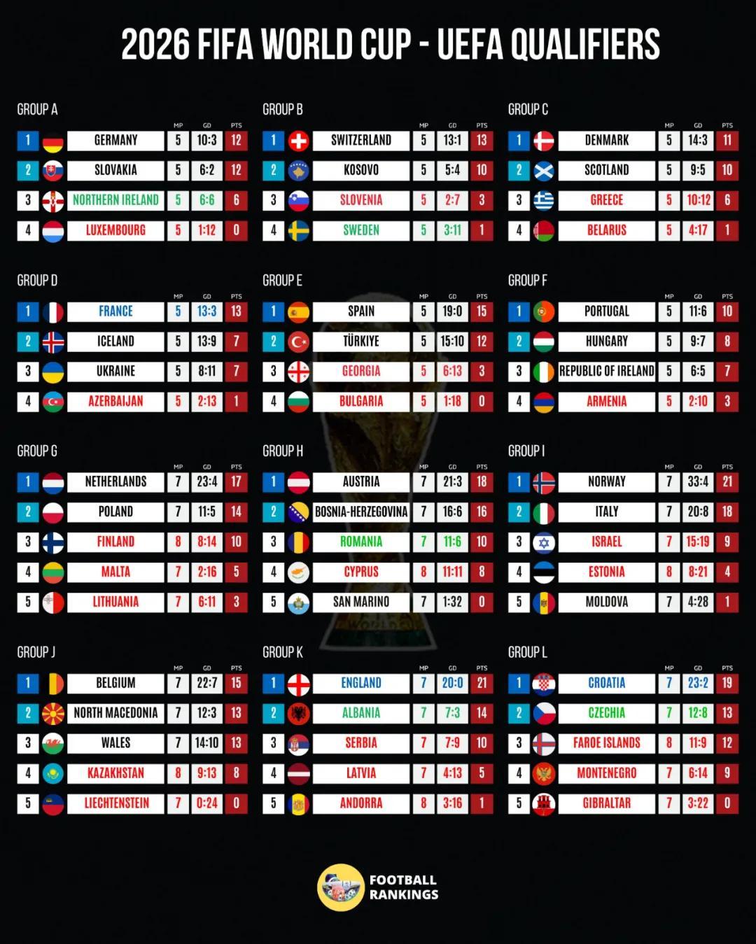 歐洲區除了12個直接出線名額基本明朗,16個附加賽名額也大半確定。12個小組第2之中,科索沃、土耳其、波蘭、意大利、阿爾巴尼亞、捷克6隊確定入圍附加賽,另外6個名額,A組(德國/斯洛伐克)、C組(丹麥/蘇格蘭)、H組(奧地利/波黑)末輪無緣直接出線的3支球隊進入附加賽,D組(冰島/烏克蘭)、F組(匈牙利/愛爾蘭)末輪則是小組第二生死戰,決定2個名額。J組末輪威爾士主場對北馬其頓,兩隊均已確定附加賽資格,區別只是以小組第二還是歐國聯成績入圍。