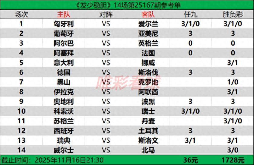【發少穩膽25167期勝負彩14場(1728元)任九(36元)推薦方案】