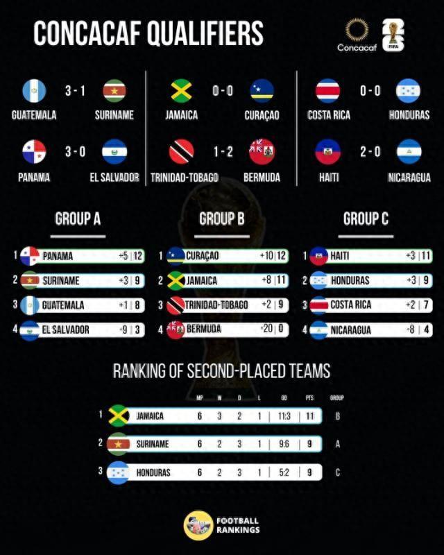 B組形勢未發生變化,庫拉索客場0比0悶平牙買加,保住了小組頭名直出資格。C組海地2比0戰勝尼加拉瓜,而洪都拉斯0比0客平哥斯達黎加,海地彎道超車晉級,洪都拉斯打附加賽。