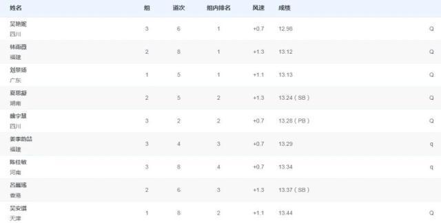 根據晉級規則,三個小組每組前兩名以及剩餘選手中預賽總成績最好的兩名選手,共計8名選手晉級今晚的決賽。四川選手吳豔妮在預賽第三組第六道登場,她發揮穩定跑出12秒98位列小組第一,順利晉級決賽,她的四川隊隊友魏宇慧跑出個人最好成績13秒28獲得這一小組的第二名,同樣晉級決賽。