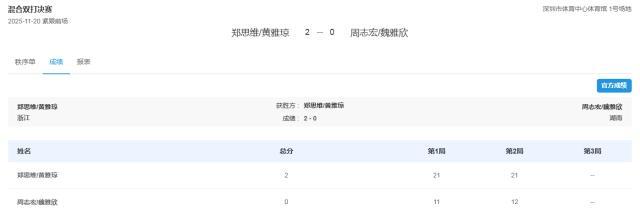 首局比賽,周志宏/魏雅欣開局取得4比2領先,隨後鄭思維/黃雅瓊連得5分將比分反超。本局中後段,“雅思”組合始終牢牢佔據着場面上的優勢,他們在連得6分之後取得20比10的巨幅領先,並最終以21比11贏下這一局。