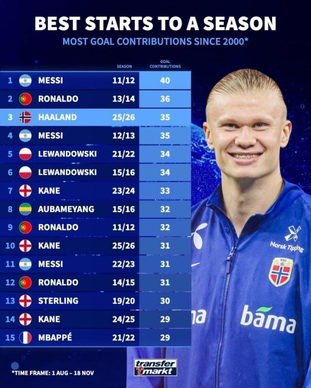11月20日訊 德轉統計了本世紀賽季開局的進球貢獻數,哈蘭德以35粒進球位居歷史第三,僅次於梅西和C羅。