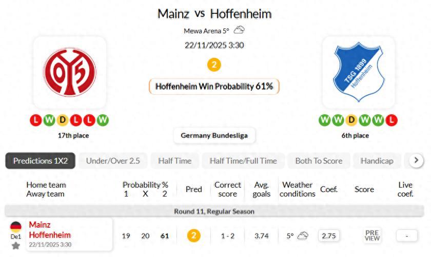 霍芬海姆最近聯賽7次客場迎戰美因茨僅贏了一場