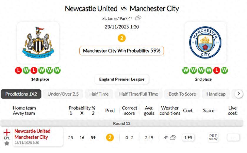 曼城在英超對陣紐卡斯爾聯的最近12場比賽中保持不敗