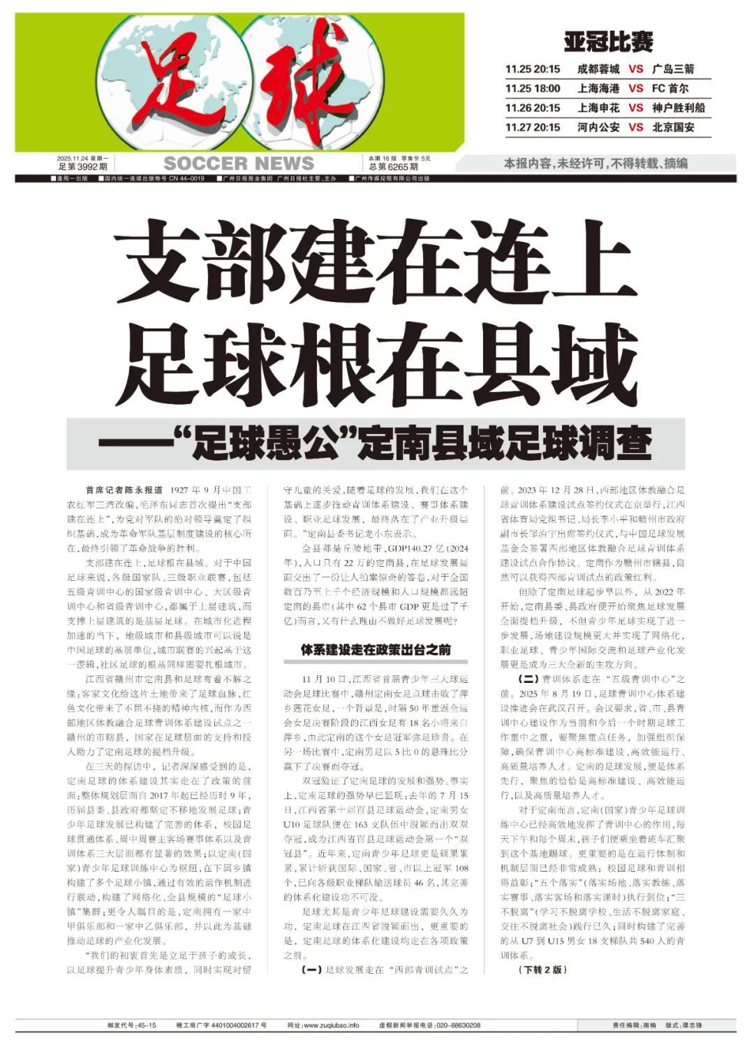 大河有水小河滿,足球的發展需要頂層設計;小河有水大河滿,足球的發展更需要基層足球的全面發展。中國足球的發展,需要自上而下的頂層設計和治理體系,更需要自下而上的積極承接和治理層面的倒逼。在《足球》報的近期系列報道中,地市足球發展如張家口市足球發展模式,縣域足球發展如定南足球發展模式,包括“村超”“蘇超”所代表的新興賽事體系,都展現出了這種自下而上的承接。