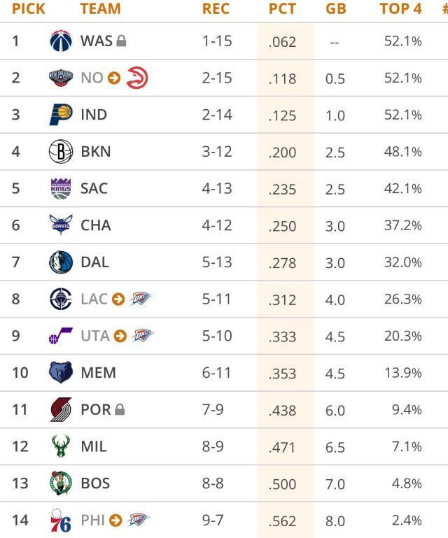 更讓人脊背發涼的是下面這張圖,如果今日開啓NBA選秀樂透抽籤,雷霆甚至可能收穫三個明年的樂透籤——分別來自快艇、爵士和76人。