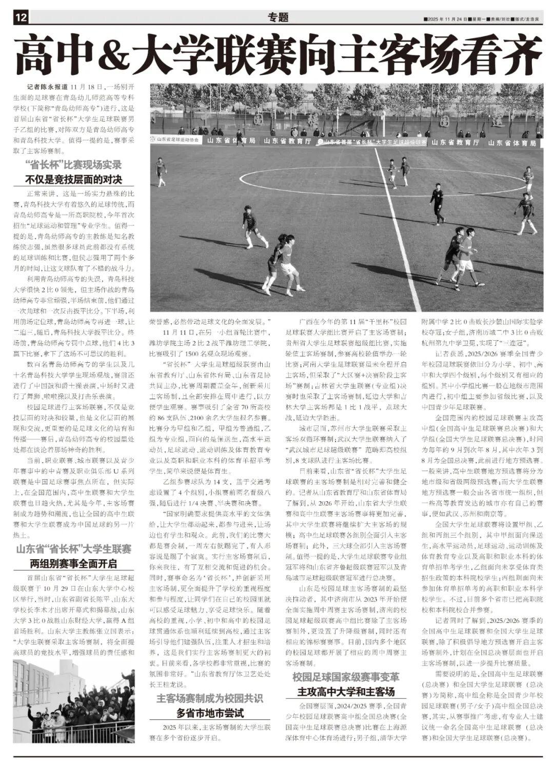 目前來看,山東省“省長杯”大學生足球聯賽的主客場賽制是相對完善和健全的。記者從山東省教育廳和山東省體育局瞭解到,從2026年開始,山東省大學生聯賽和高中生聯賽主客場賽事將更加完善,其中大學生聯賽將繼續擴大主客場的規模;高中生足球聯賽各組別全面引入主客場賽制;此外,三大球全部引入主客場賽制。值得一提的是,大學生足球聯賽專業組冠軍將和山東省齊魯超級聯賽冠軍以及青島城市足球超級聯賽冠軍進行總決賽。