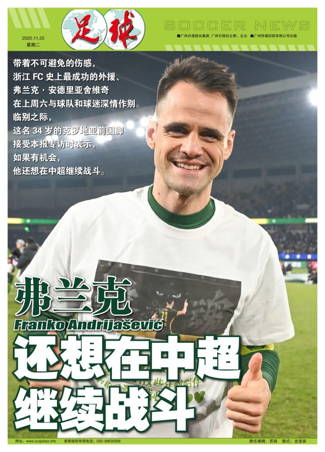 撰稿/左瑞 帶着不可避免的傷感,浙江FC史上最成功的外援弗蘭克·安德里亞舍維奇在上週六與球隊和球迷深情作別。臨別之際,這名34歲的克羅地亞前國腳接受本報專訪時表示,如果有機會,他還想在中超繼續戰鬥。
