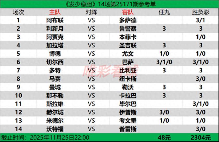 【發少穩膽25171期勝負彩14場(2304元)任九(48元)推薦方案】