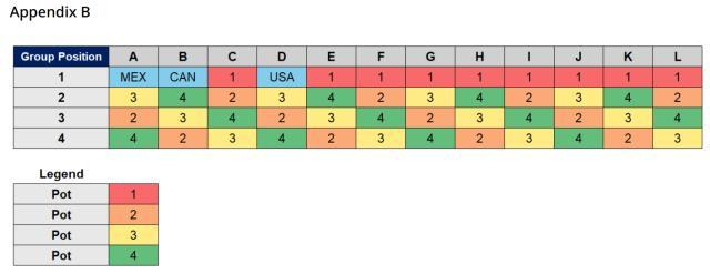 同時,FIFA還確定了各檔位球隊小組賽的對手順序。這與以前不同,往屆世界盃除第1檔球隊會確定作爲小組中第1籤位外,其他檔位球隊的籤位會隨機抽取。而今,身爲東道主之一的美國隊,他們作爲第1檔球隊,將首先迎戰第3檔球隊,然後對陣第2檔球隊,末輪出戰第4檔球隊。但是注意,並非每個種子隊都是這個順序,而是存在各式排列組合。目前FIFA已確定各組對陣順序(下圖)。
