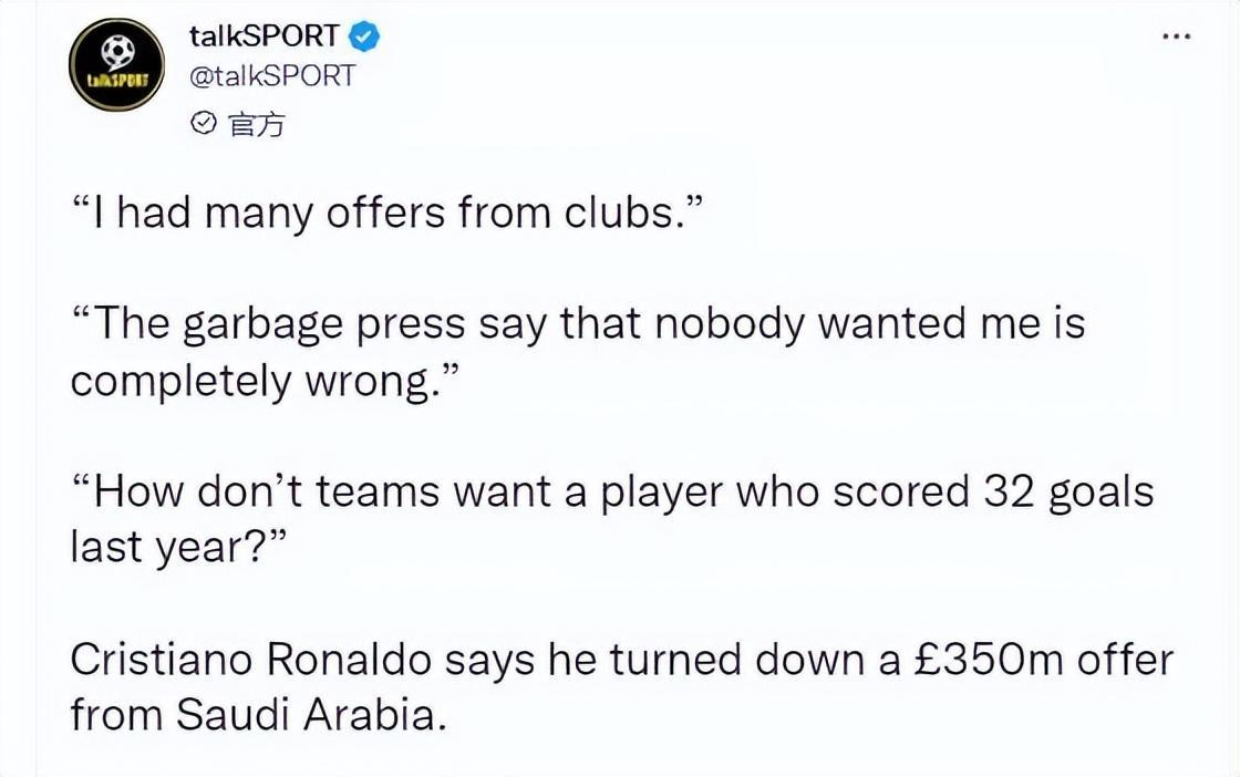 C羅:“這是我要澄清的。我的經紀人門德斯旗下有超過100名球員,他去切爾西或者去阿森納,大家都會說他在兜售我,我還被‘推薦’給葡萄牙體育和那不勒斯。哪怕我已經37歲了,我仍然是英超史上最高薪球員。媒體總說沒有球隊要我,純屬是胡扯。除了沙特之外,我還有很多來自其他俱樂部的報價,我沒有轉會是沒有打算離開曼聯。我在曼聯過得很開心,我仍然有動力踢出一個出色的賽季。”