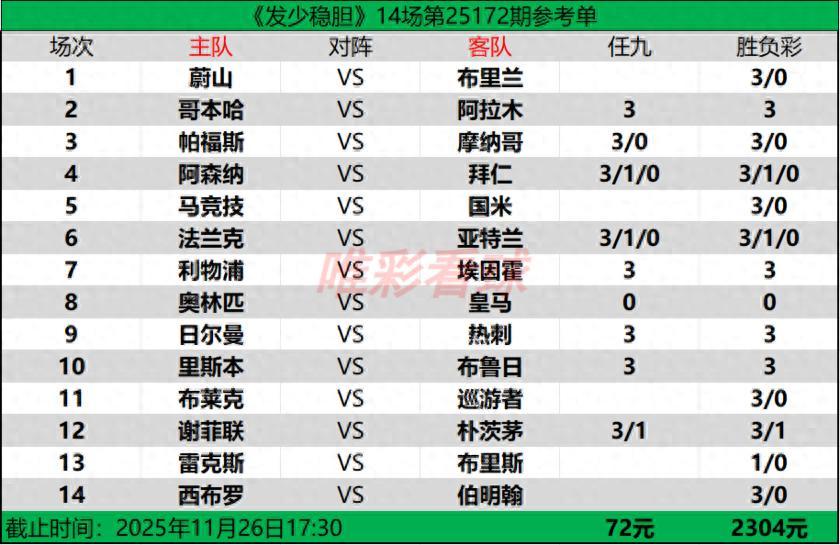 【發少穩膽25172期勝負彩14場(2304元)任九(72元)推薦方案】