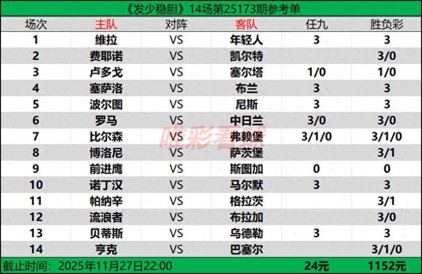 【發少穩膽25173期勝負彩14場(1152元)任九(24元)推薦方案】