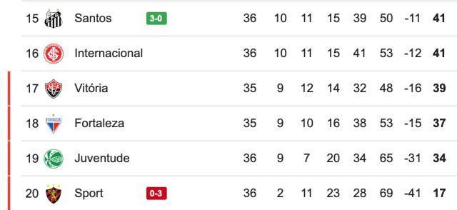 桑托斯保級的最大威脅是隻落後1個淨勝球的巴西國際和少賽1場落後2分的維多利亞,前者最後2個對手是聖保羅(客)和紅牛(主),後者最後3輪對手是米拉索爾(主)、紅牛(客)和聖保羅(主),雖然都是積分榜中上游的球隊,但也都無所追求缺乏戰意。桑托斯除了要保證自己拿下全部分數,也要指望對手掉鏈子才成。倒數第3的福塔雷薩也有機會,但需要前面三隊同時丟分。