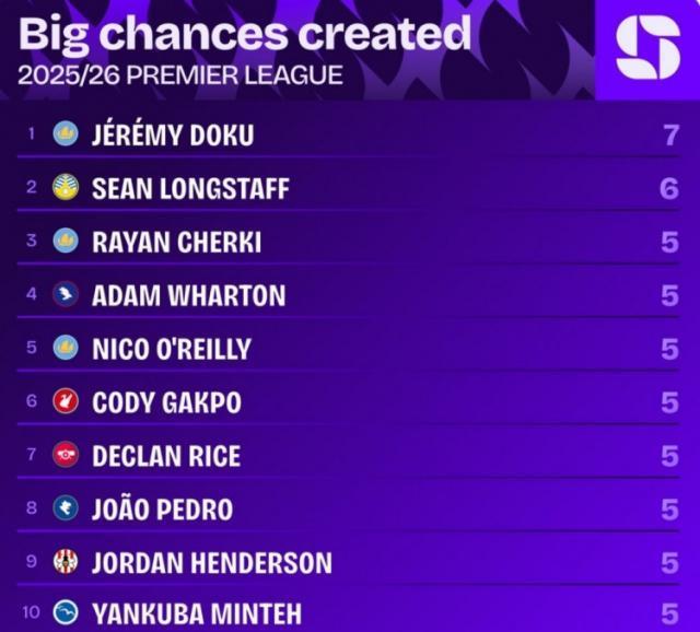 Squawka統計了球員本賽季英超創造重大機會的次數,並列出榜單,多庫7次最多。英超本賽季創造重大機會排名: