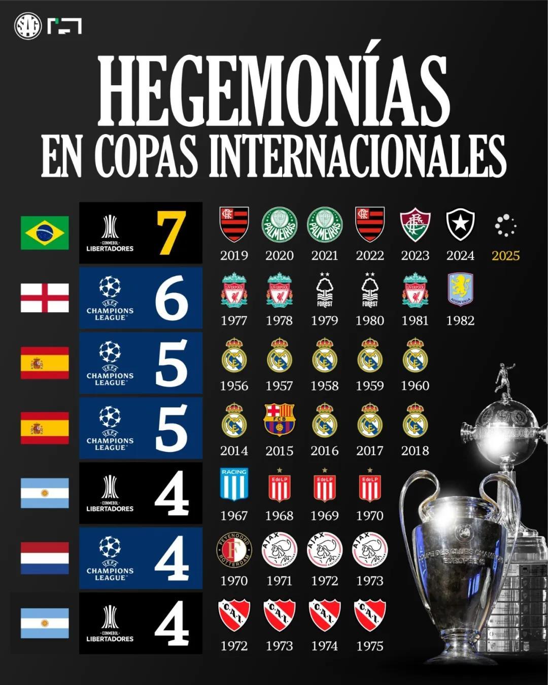 撰稿/寒冰 解放者杯是南美俱樂部最高賽事,1960年創辦以來,多達7個國家的球隊曾問鼎冠軍。但隨着北京時間今天凌晨弗拉門戈1比0擊敗帕爾梅拉斯奪冠,2019年至今巴西球隊取得了創紀錄的7連冠,包攬期間全部獎盃。7次決賽有多達5次像今年一樣,是巴西球隊“內戰”。阿根廷的河牀(2019年)和博卡青年(2023年)曾分別進入決賽,均無力挑戰巴西球隊的壟斷。正如巴西《環球體育》所言,解放者杯正在成爲巴甲和巴西杯之後,第3項屬於巴西的“頂級賽事”。