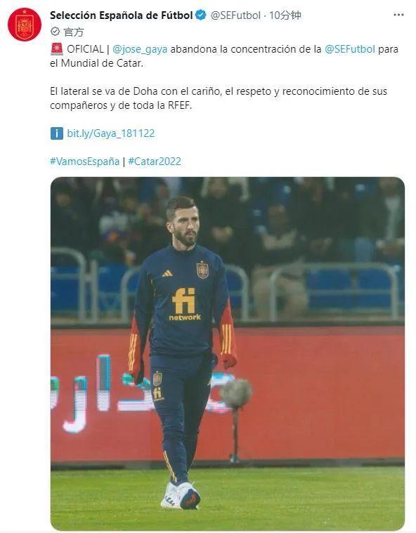 而同樣是昨日,西班牙的正選左後衛加亞也因爲右腳踝扭傷退出國家隊名單,儘管瓦倫西亞隊長的傷勢並不算太重,但恩裏克在與醫療團隊溝通後仍決定不去冒險,並選擇補招了19歲的巴薩小將巴爾德進入大名單。