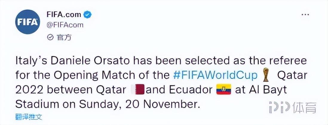 19日凌晨,國際足聯官方宣佈,意大利裁判奧爾薩託將吹罰世界盃揭幕戰。現年46歲的奧爾薩託來自意大利,在2010年成爲職業裁判,他吹罰過2020年拜仁1-0巴黎的歐冠決賽,並被評爲當年最佳裁判。他將在當地時間11月20日吹罰卡塔爾vs厄瓜多爾的世界盃揭幕戰。而衆所周知,意大利隊未能晉級此次世界盃。