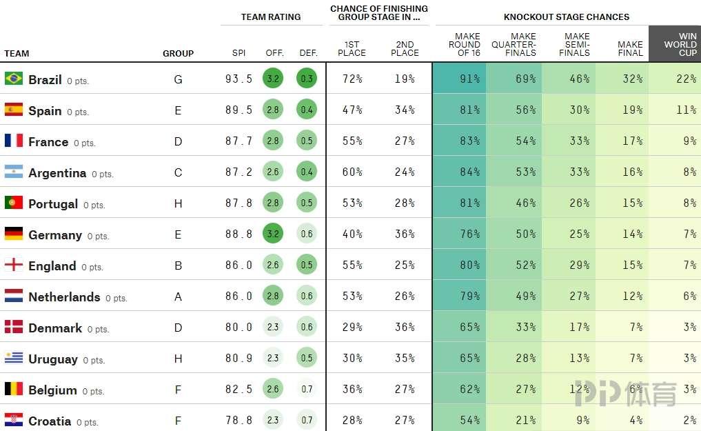 2022世界盃還有不到2天就將開打,大數據網站fivethirtyeight預測了本屆賽事32強的奪冠概率。巴西以22%的概率遙遙領先,西班牙11%第二,衛冕冠軍法國9%第三,阿根廷、葡萄牙均爲8%。大數據預測世界盃奪冠概率:1、巴西,22%2、西班牙,11%3、法國,9%4、阿根廷、葡萄牙,8%6、德國、英格蘭,7%8、荷蘭,6%9、丹麥、烏拉圭、比利時,3%12、克羅地亞,2%其餘20隊奪冠概率均不高於1%。