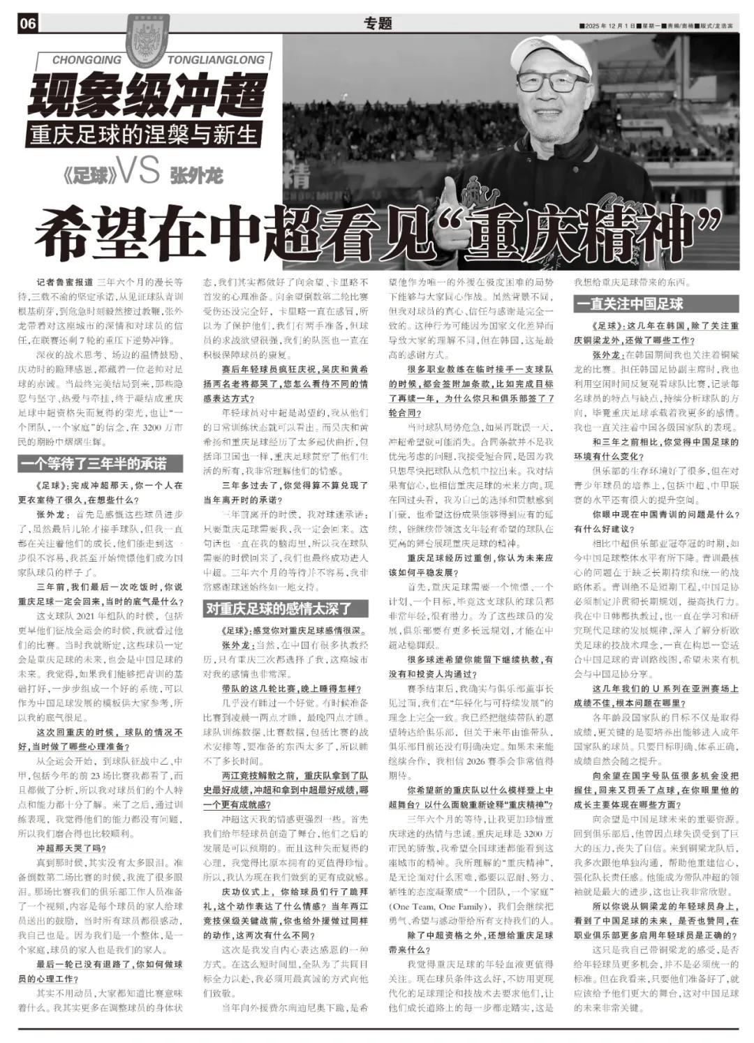當時球隊局勢危急,如果再耽誤一天,衝超希望就可能消失。合同條款並不是我優先考慮的問題,我接受短合同,是因爲我只想盡快把球隊從危機中拉出來。我對結果有信心,也相信重慶足球的未來方向。現在回過頭看,我爲自己的選擇和貢獻感到自豪,也希望這份成果能夠得到應有的延續,能繼續帶領這支年輕有希望的球隊在更高的舞臺展現重慶足球的精神。