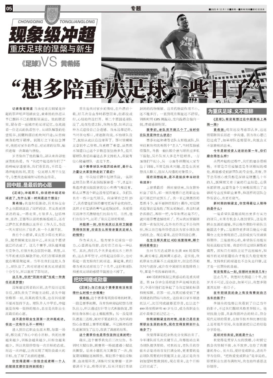 記者魯蜜報道 當決定重慶銅梁龍衝超的那聲哨聲劃破夜空,黃希揚的熱淚從早已顫抖不已的眼眶裏湧出,他的眼淚裏,留存着一座城市的足球記憶,也流淌着一位老兵的執着堅守。從球隊解散的絕望低谷,到輾轉漂泊的坎坷歸途;從傷病纏身的咬牙硬撐,到孤燈之下的信念博弈,他把對家鄉的眷戀、對足球的信仰,編織進每一次奔跑與拼搶。