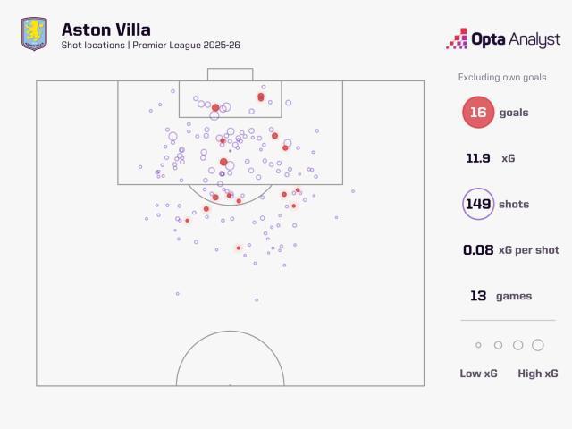 維拉本賽季射門位置分佈,紅點爲進球,7個是禁區內,9個是禁區外。
