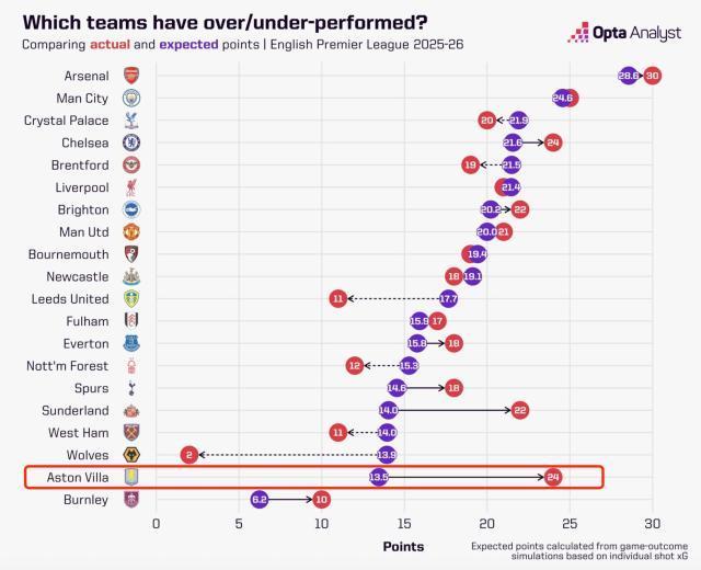 維拉是本賽季英超最“離譜”的球隊,預期13.5分實際拿到24分,反面則是狼隊,預期13.9分比維拉還高,但實際只有2分。