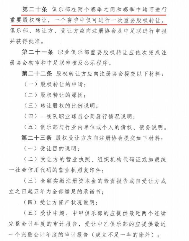 3、此前規定賽季中不得進行重要股權轉讓,現在允許賽季中進行一次重要股權轉讓。