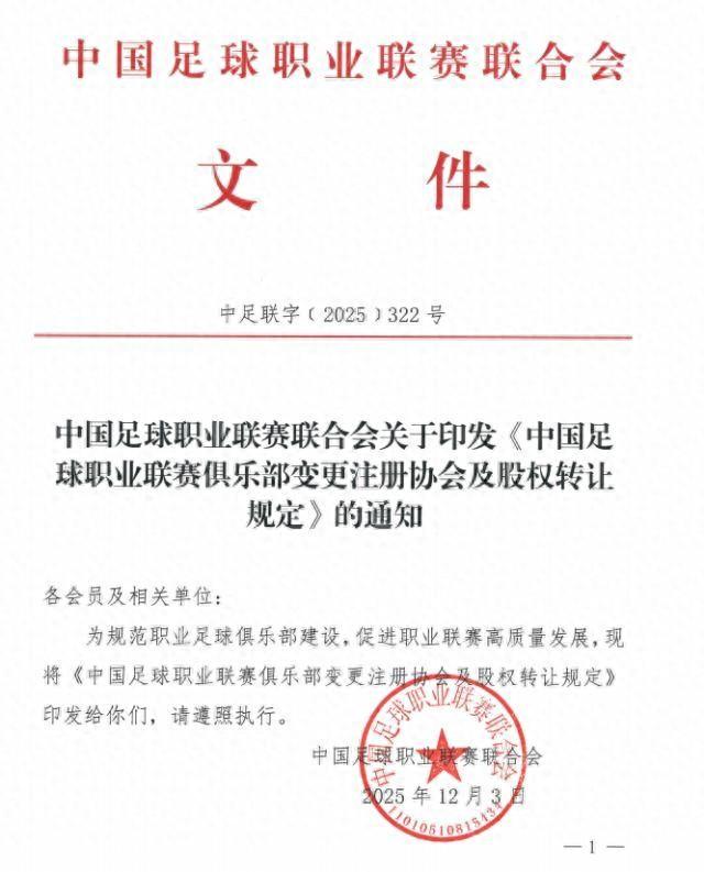 12月3日,中國足球職業聯賽聯合會發佈了《中國足球職業聯賽俱樂部變更註冊協會及股權轉讓規定》,該文件是2024年中國足協發佈的《中國足球協會男子職業俱樂部變更註冊會員協會及股權轉讓規定(試行)》的替代性規定。