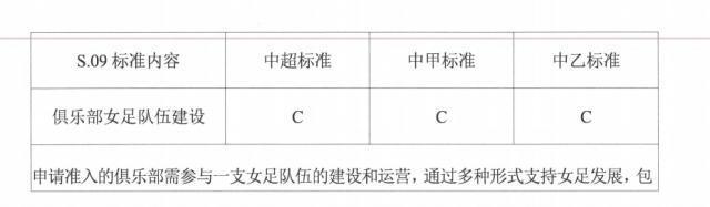 另外,涉及到俱樂部女足隊伍建設,中超標準更改爲“C”,即不再強制要求中超俱樂部設立女足球隊。同時,中甲和中乙標準不變,依舊爲“C”。