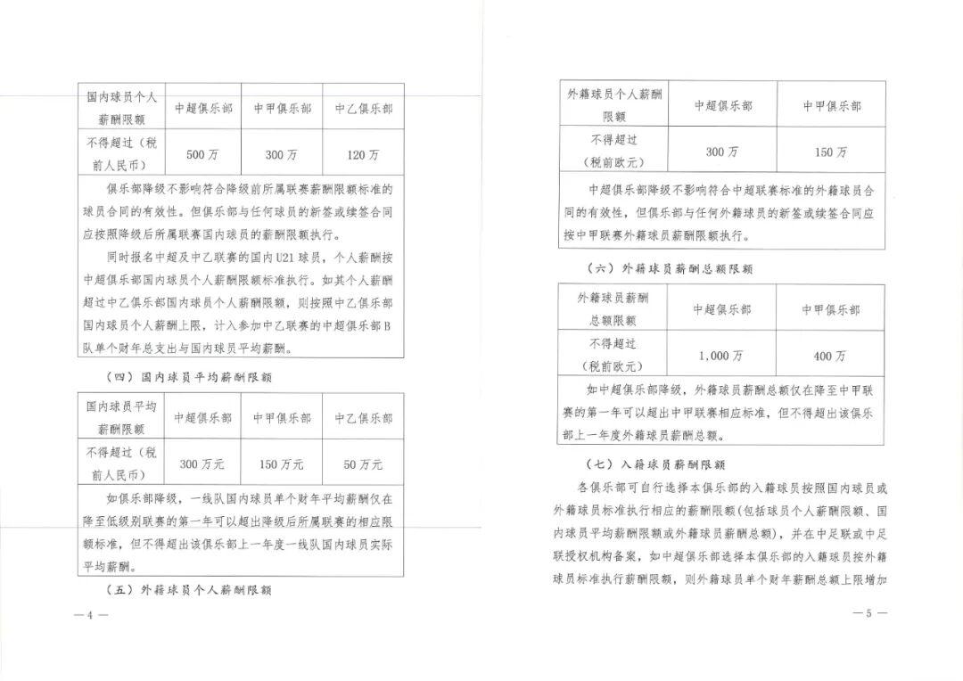 總體上各項指標延續性較強,值得留意的變化在於:其一,入籍球員個人薪酬限額如果執行外籍球員個人薪酬限額標準,則外籍球員個人薪酬限額增加200萬歐元(稅前,下同)到1200歐元(中甲增加80萬歐元到480萬歐元),但外援本身的薪酬限額仍舊是1000萬歐元和400萬歐元;其二,同時參加中超和中乙的俱樂部(即擁有中超B隊的俱樂部),需同時滿足俱樂部總支出不超過中超總支出限額要求、參加中乙聯賽的B隊總支出不超過中乙總支出限額要求;其三,同時報名中超及中乙聯賽的國內U21球員,個人薪酬按中超俱樂部國內球員個人薪酬限額標準執行,如其個人薪酬超過中乙俱樂部國內球員個人薪酬限額,則按照中乙俱樂部國內球員個人薪酬上限,計入參加中乙聯賽的中超俱樂部B隊單個財年總支出與國內球員平均薪酬。