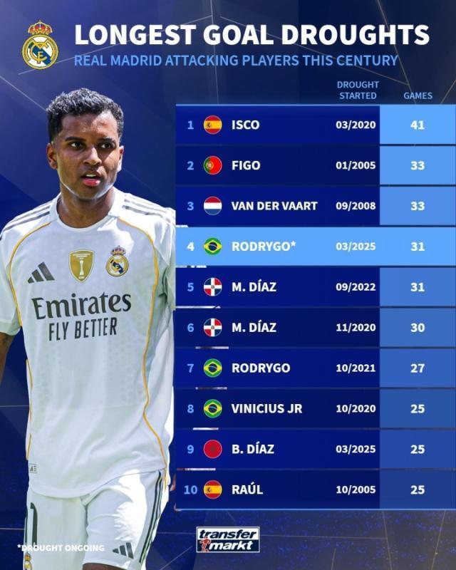 羅德里戈31場球荒 是本世紀皇馬進攻球員第4長的球荒