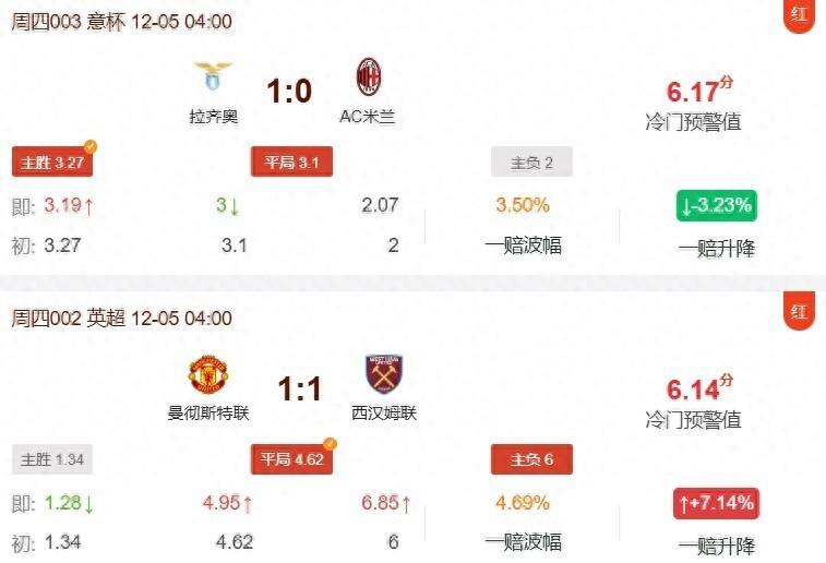 昨日唯彩看球冷門預警工具精準捕捉到兩大冷門賽果:AC米蘭客場負於拉齊奧(主勝賠率達3.27),以及曼聯主場被西漢姆聯逼平(平局賠率高達4.62)。這兩次成功命中,有力證明了我們分析模型的準確性與前瞻性。
